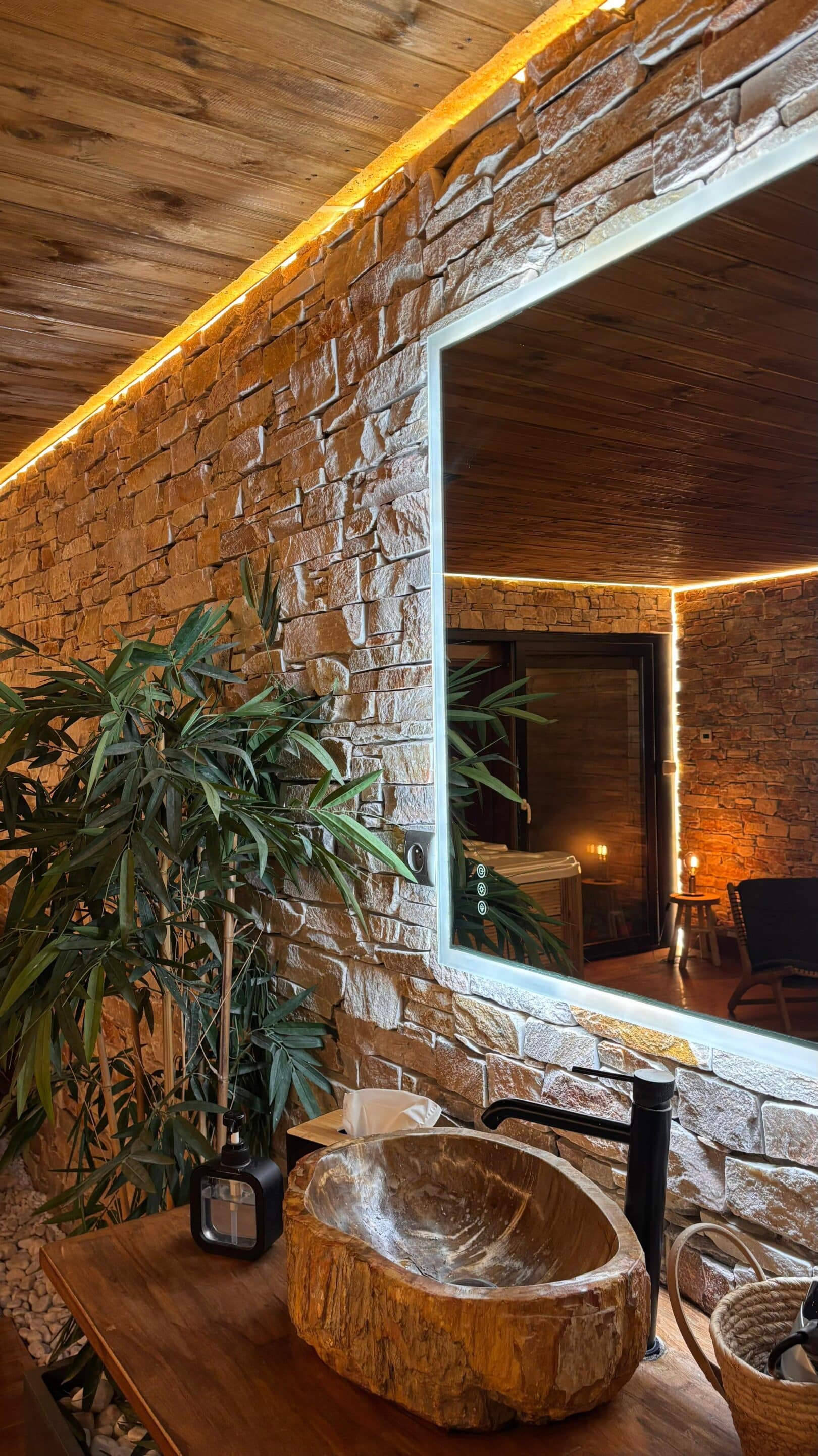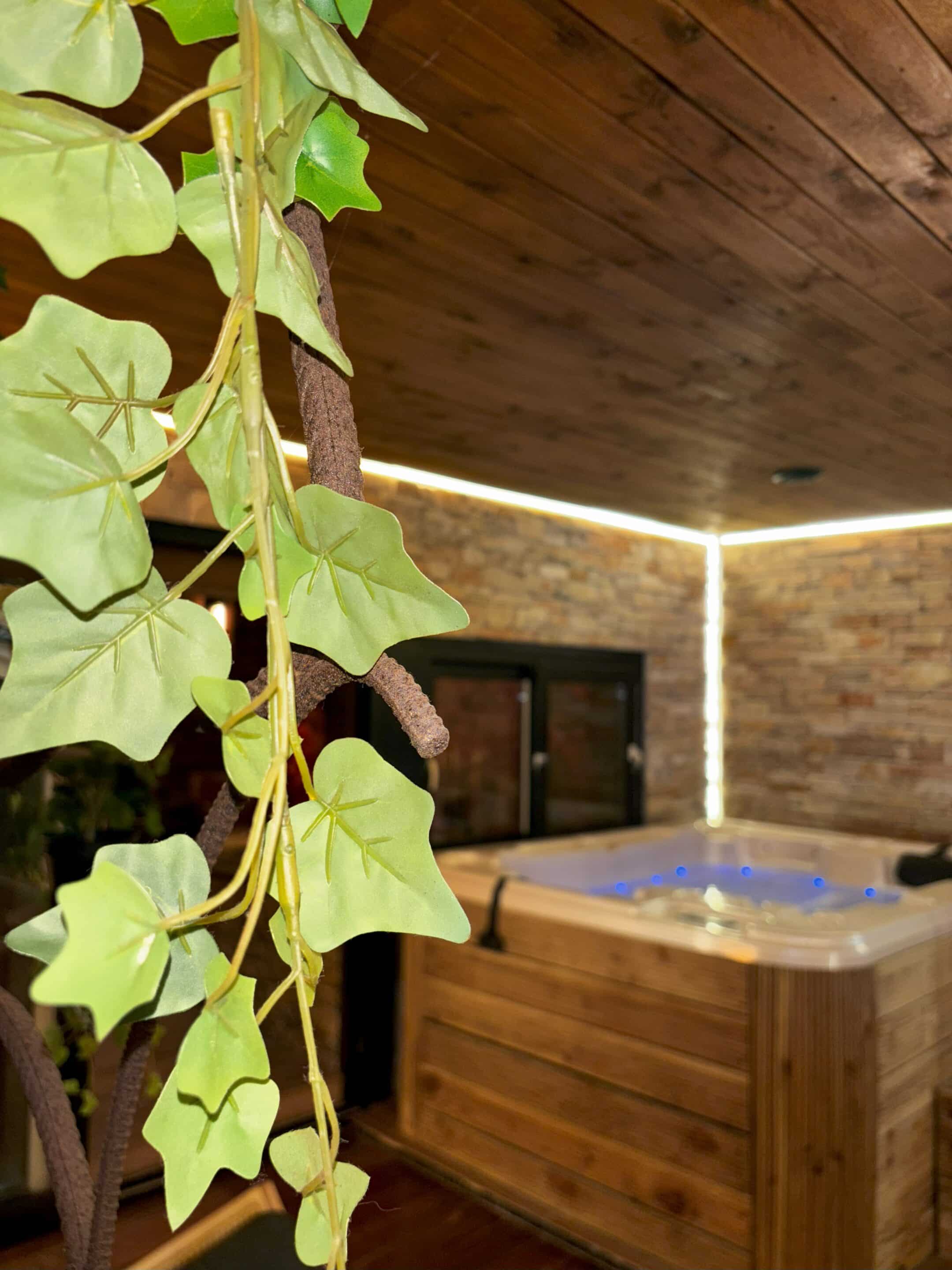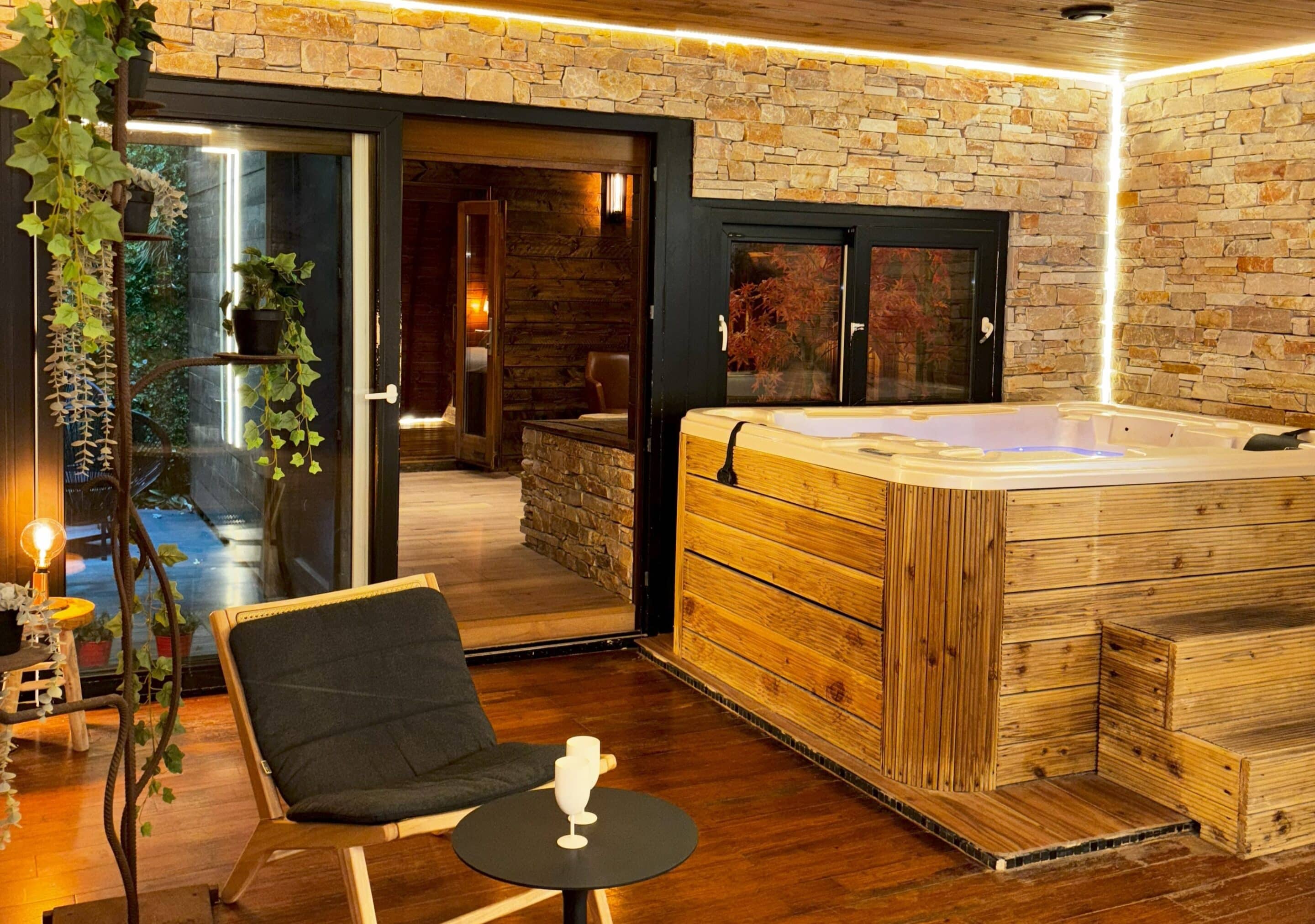 - La pièce d’eau : la chaleur du parquet massif, le mur en pierre naturelle, le Jacuzzi privatif et le sauna font que dès qu’on y entre on s’y sent bien