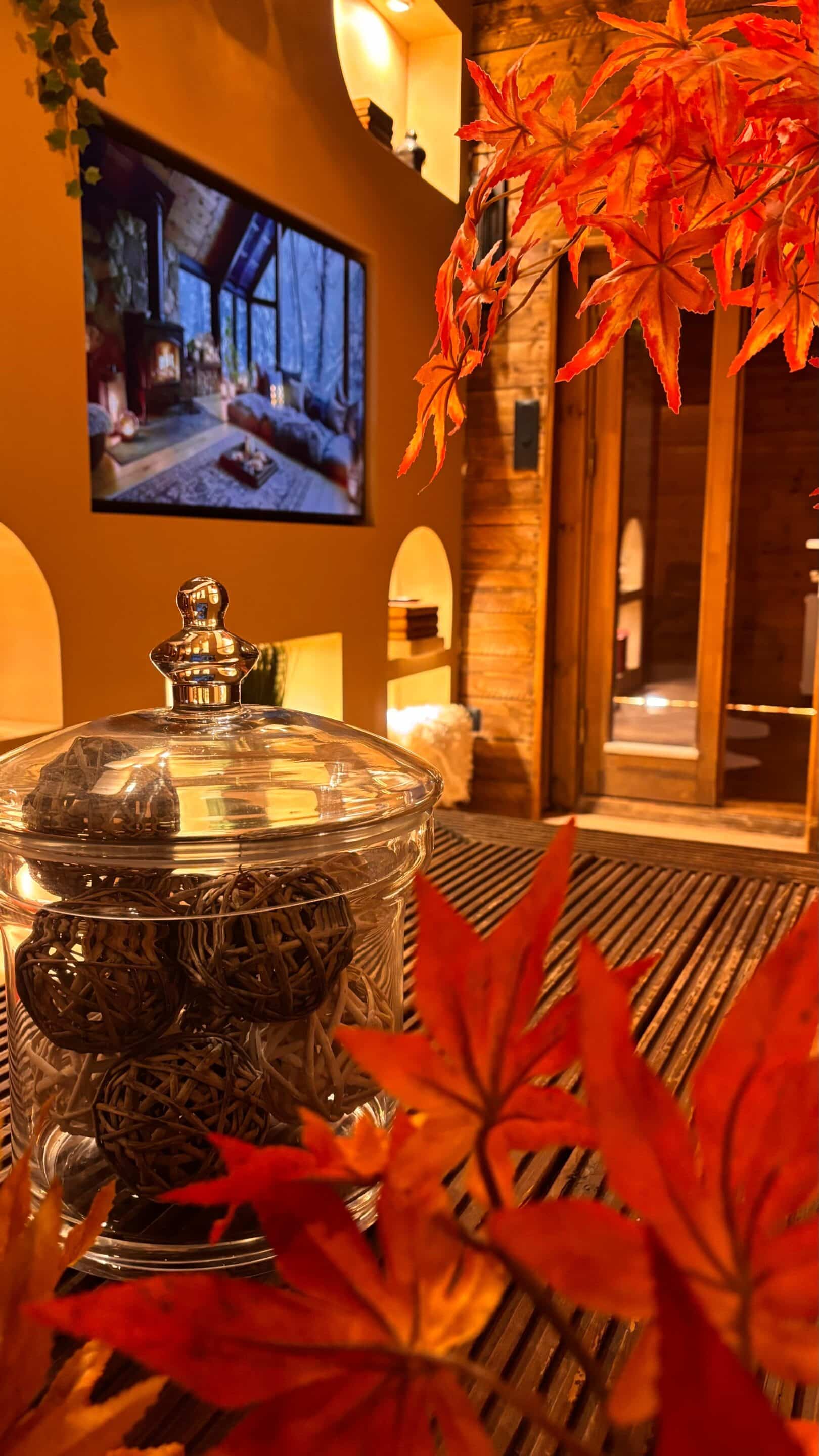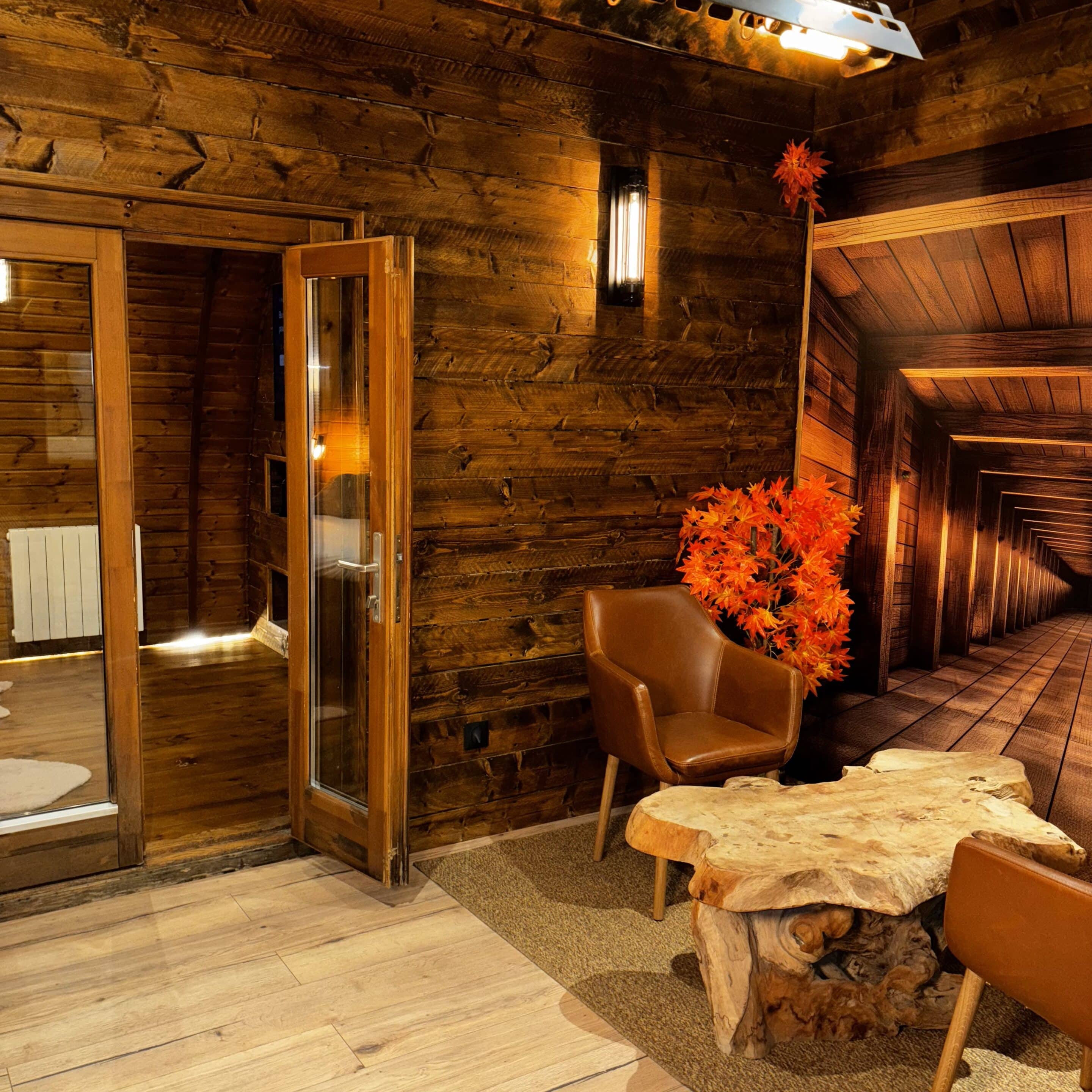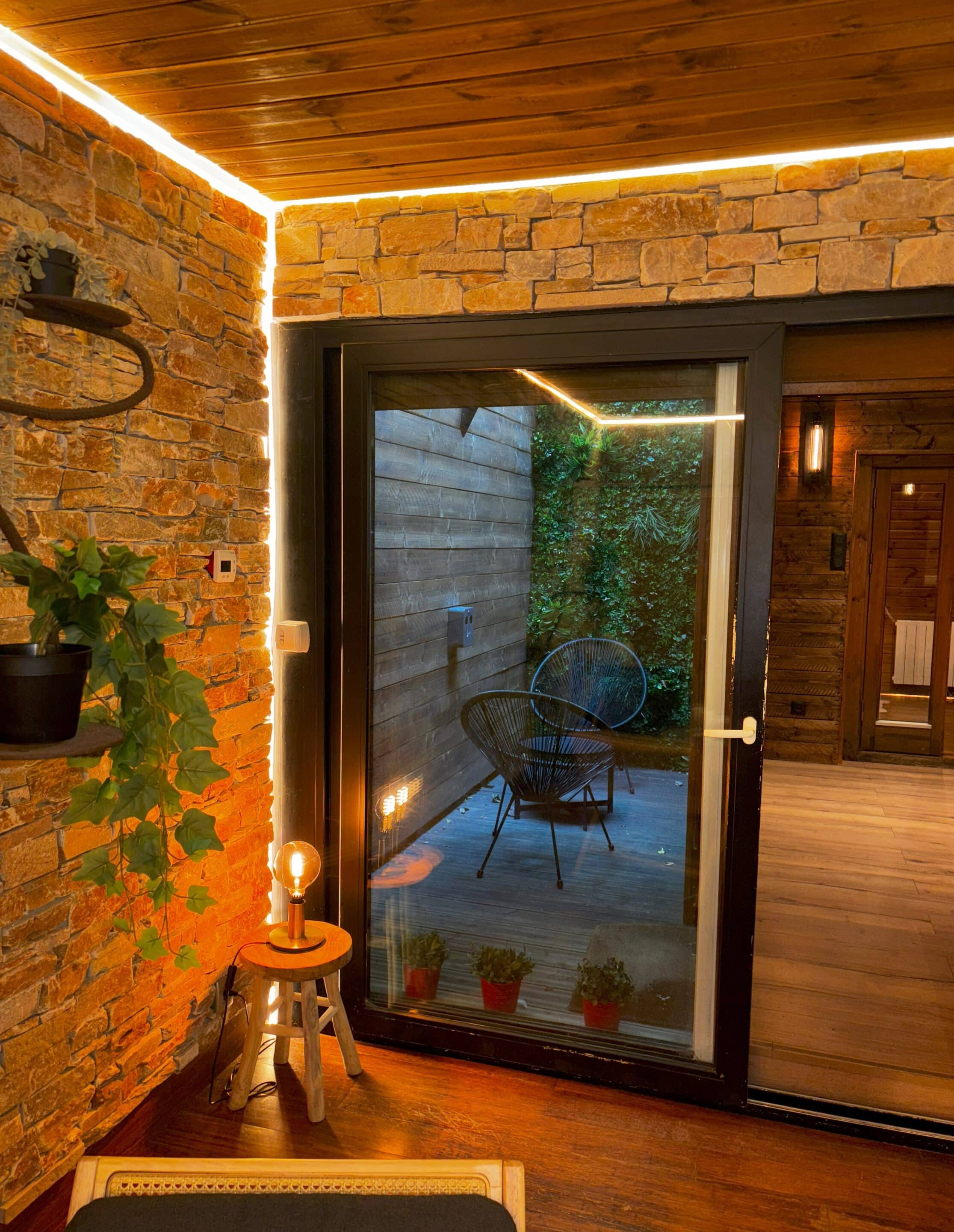 - La pièce d’eau : la chaleur du parquet massif, le mur en pierre naturelle, le Jacuzzi privatif et le sauna font que dès qu’on y entre on s’y sent bien